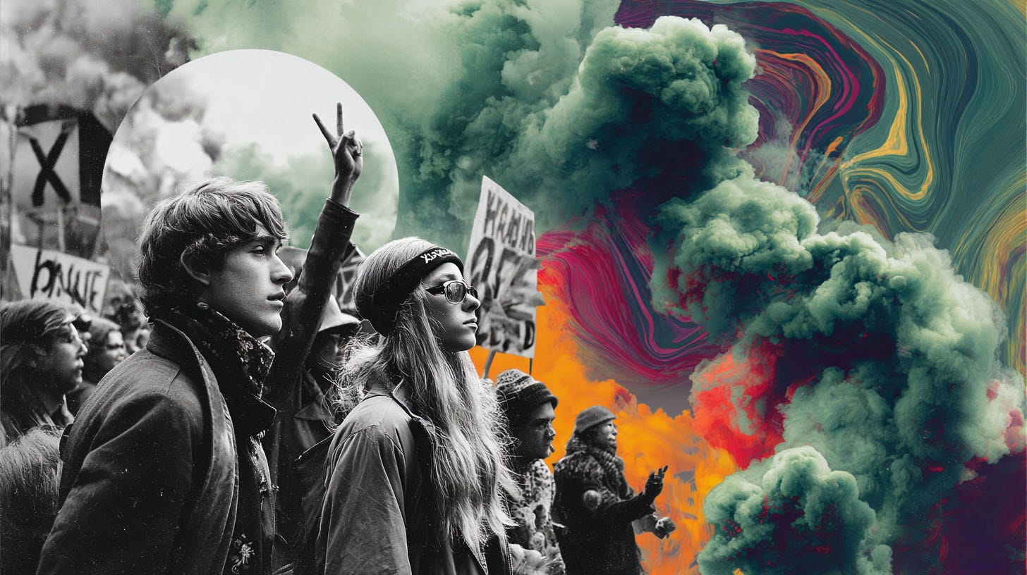 Mientras tanto, afuera, en las calles de esta tierra de la libertad y hogar de los valientes... ¡ja! Se estaba cocinando algo grande y podrido. Los jóvenes empezaban a ver Vietnam no como una aventura, sino como un maldito matadero. Las madres lloraban. Los reclutamientos eran órdenes de muerte. Y el gobierno... ah, el gobierno seguía con su discurso. La confianza se estaba pudriendo más rápido que un cadáver al sol.